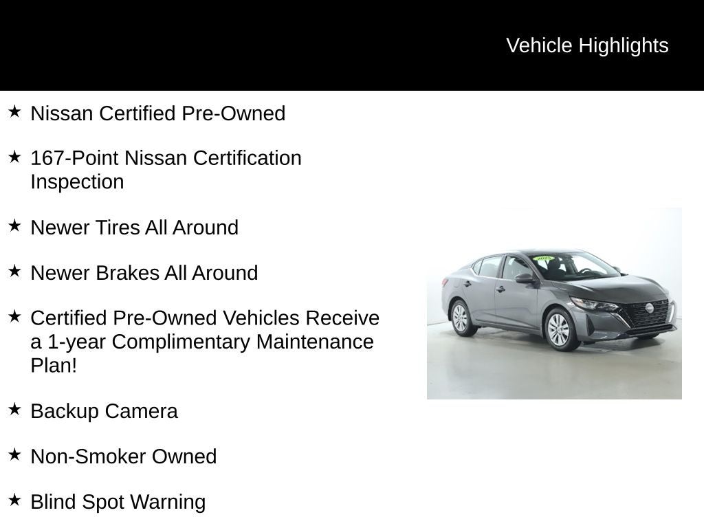 Discover the perfect blend of style, efficiency, and advanced technology in this 2025 Nissan Sentra S. With its sleek exterior, impressive fuel economy, and host of cutting-edge features, this Certified Pre-Owned Sentra is the ideal choice for the savvy driver seeking a reliable and well-equipped compact sedan.